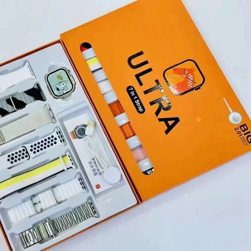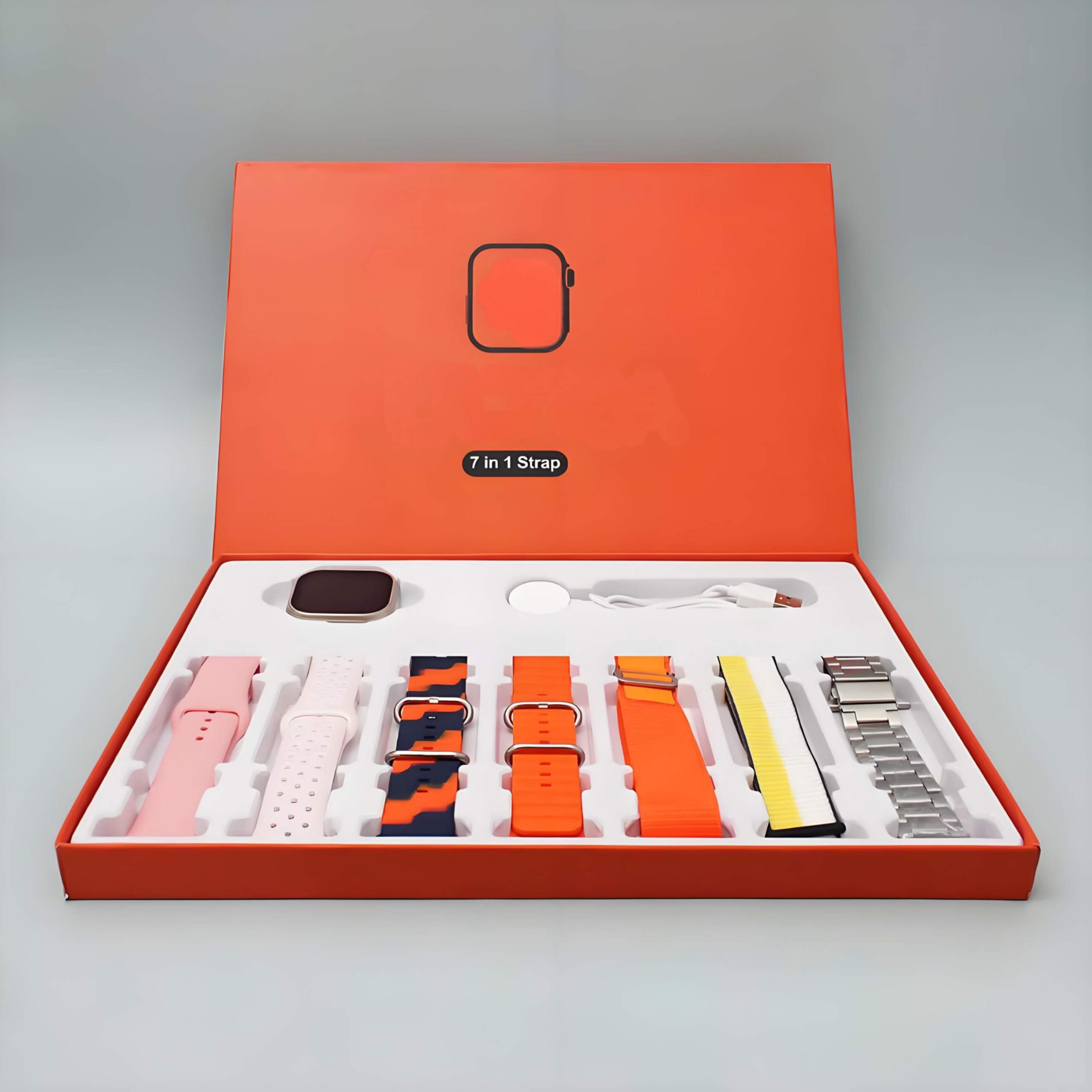 Introducing the 7-in-1 Smartwatch Combo, designed to blend sleek technology with personalized style. Featuring seven interchangeable straps, this smartwatch is perfect for every outfit and occasion, keeping you chic and connected wherever you go.